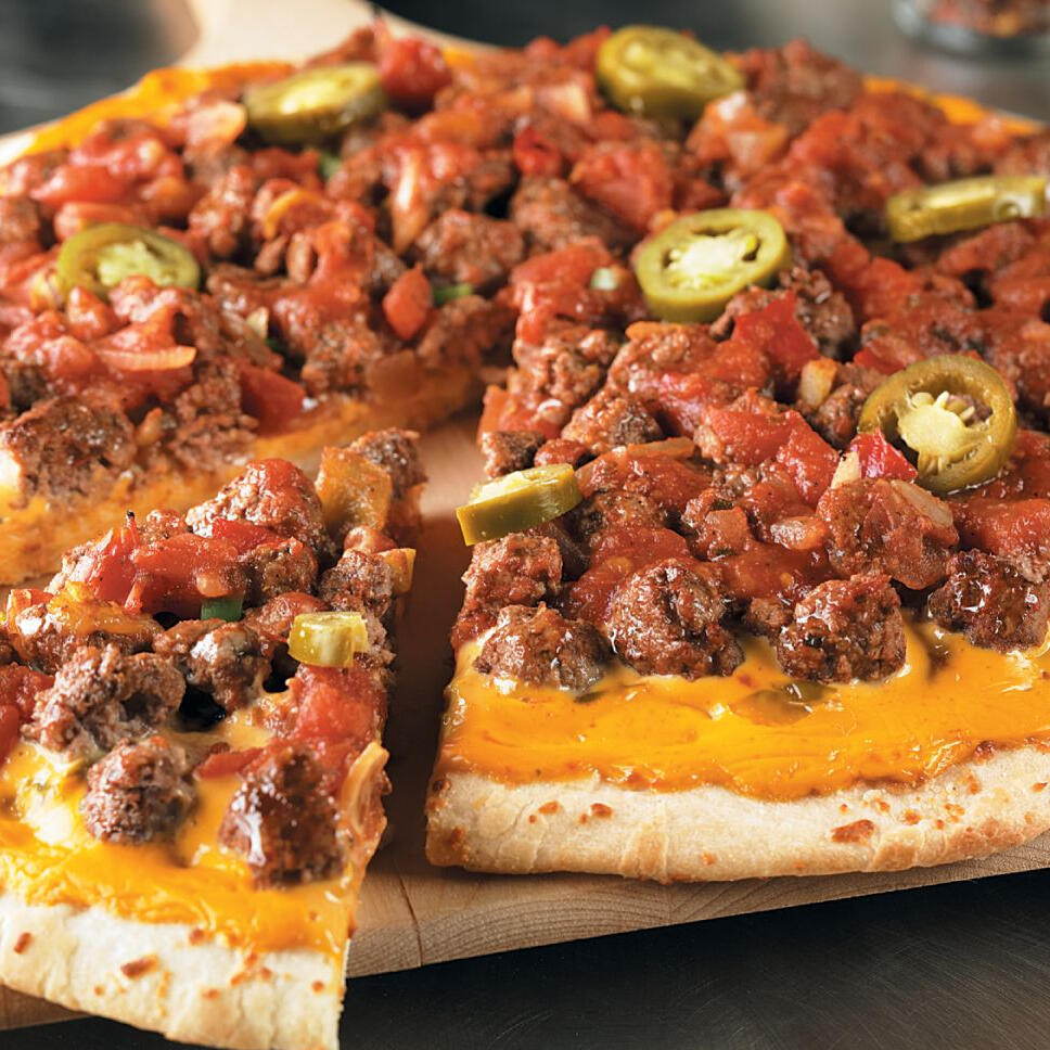 Grilled buffalo beef chunks on top of melted cheese with cuts of sliced peppers and tomato make this cheeseburger-inspired pizza a hearty, flavourful feast.(( Represented in-game as HQ pizza. ))