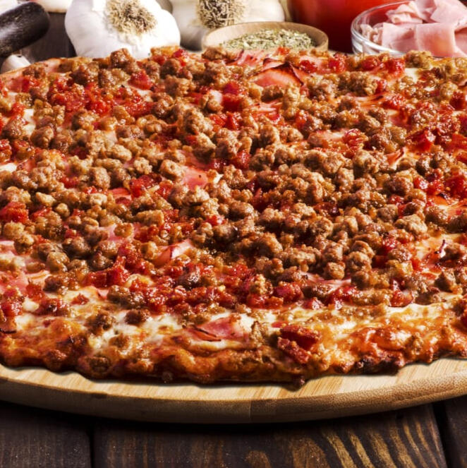 This hefty pizza dish packed with four succulent types of meat—beef, sausage, pepperoni, and seasoned ham—is sure to satisfy the appetites of carnivores everywhere!(( Represented in-game as HQ pizza. ))