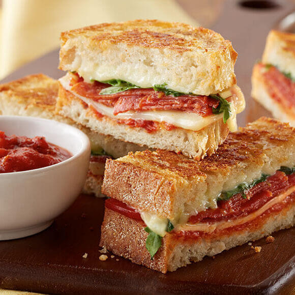 Traditional grilled cheese, with a Pukuroni twist! Placed between two cuts of buttered and toasted walnut bread, this sandwich—made with sliced pepperoni, buffalo milk cheese, basil and La Noscean lettuce—is all you could ever want from a pizza in a sandwich.
