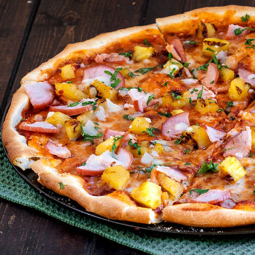 Our pan-grilled pizza, replete with ham chunks and tangy BBQ sauce, aims to please with the addition of La Noscean pineapple chunks, melding both meat and fruit into a flavourful combination that is bound to be bold, but doubtless unforgettable.(( Represented in-game as HQ pizza. ))